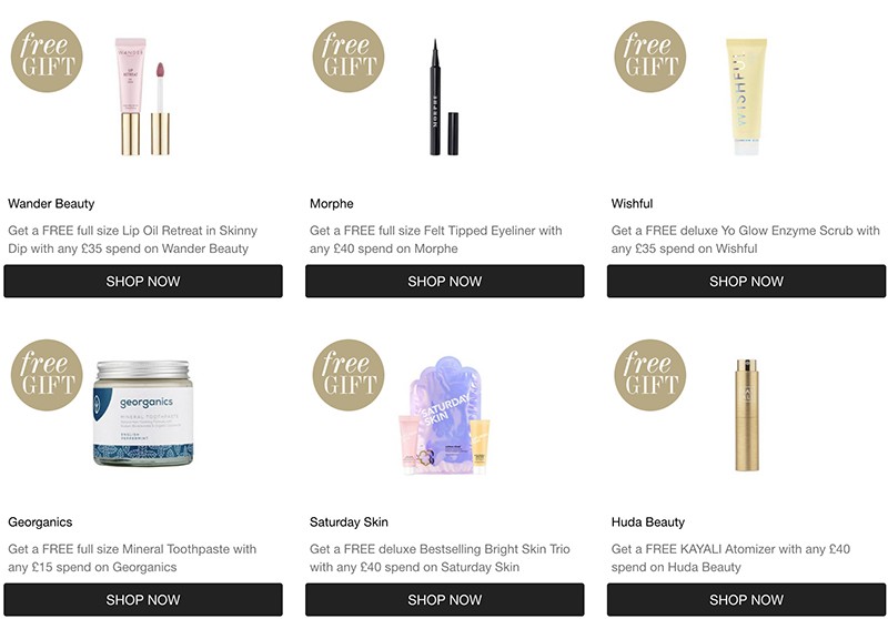 На Cult Beauty снова немного обновился раздел с подарками (включая полноразмерные офферы Wander Beauty и Morphe).
