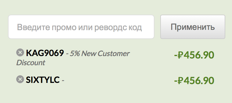 - И третье, самое главное, дали единоразовый код на скидку 5% – SIXTYLC. Этот код совмещается с моим кодом KAG9069, то есть вы можете получить скидку 10% на следующий заказ (поочередно вводите в корзине коды SIXTYLC и KAG9069).