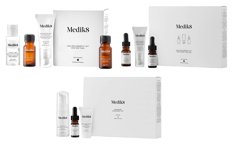 - Medik8 CSA Philosophy Discovery Kit (стоимость £39.00) – набор с сывороткой с витамином С C-Tetra Lipid Vitamin C Antioxidant Serum (10 мл), дневным солнцезащитным кремом Advanced Day Total Protect Anti-Ageing Moisturiser SPF 30 (15 мл) и сывороткой с ретинодами Retinol 3TR Intense Advanced 0.3% Vitamin A Serum (5 мл).