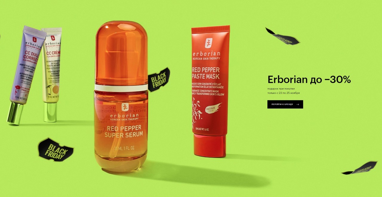 - Скидки до 30% на Erborian + подарок (при покупке от 2 000 рублей — корректирующий крем CC Red (5 мл) и крем для лица Skin Hero 5 мл, от 5 000 рублей — маска для сна «Панда» и тканевые патчи с экстрактом женьшеня, 5 г). До 26 ноября;